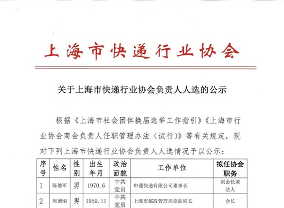 关于上海市快递行业协会负责人人选的公示 2025.07.11
